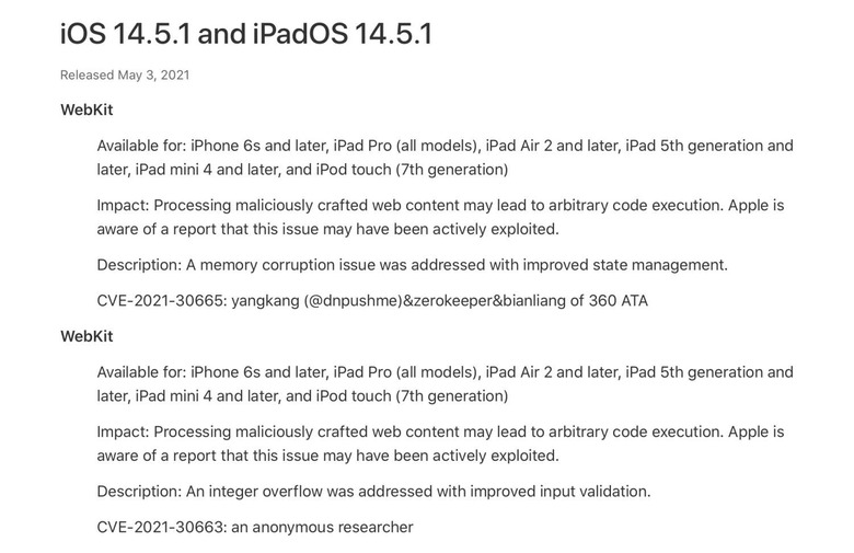 However, as part of the bug fixes and security patches that are commonplace in each iOS and iPadOS update, Apple also addressed something much more serious. Two vulnerabilities impacting WebKit, the browser engine that powers Safari on iPhone and iPad, and which can be used to display browser content in third-party apps, had been reported. iOS 14.5.1 contained the fixes.