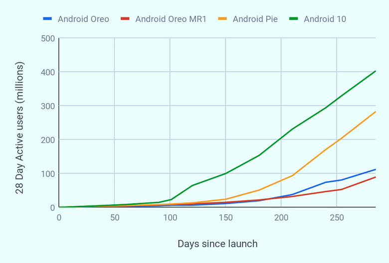 Google showed that adoption of Android 10 "has been faster than any previous versions of Android." Per their calculations, Android 10 could be found on 100 million Android devices at the 5 month checkpoint after launch, a full 28% faster than adoption of Android 9 Pie over the same period of time.