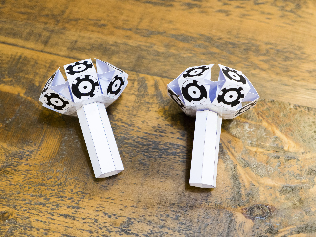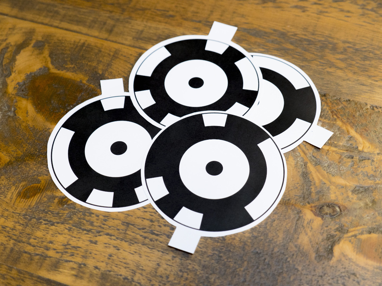The hardware side of the ZapBox is composed of three major components, all of them made from cardboard. Except for the lens you attach to the camera. The headset is pretty much like a Google Cardboard, where you slot in a smartphone for both display, camera, and processing power. There is a pair of controllers that look like candles with cups at the end. And last but definitely not the least, a set of "pointcodes", cardboard disks that define the perimeter of your augmented reality world.